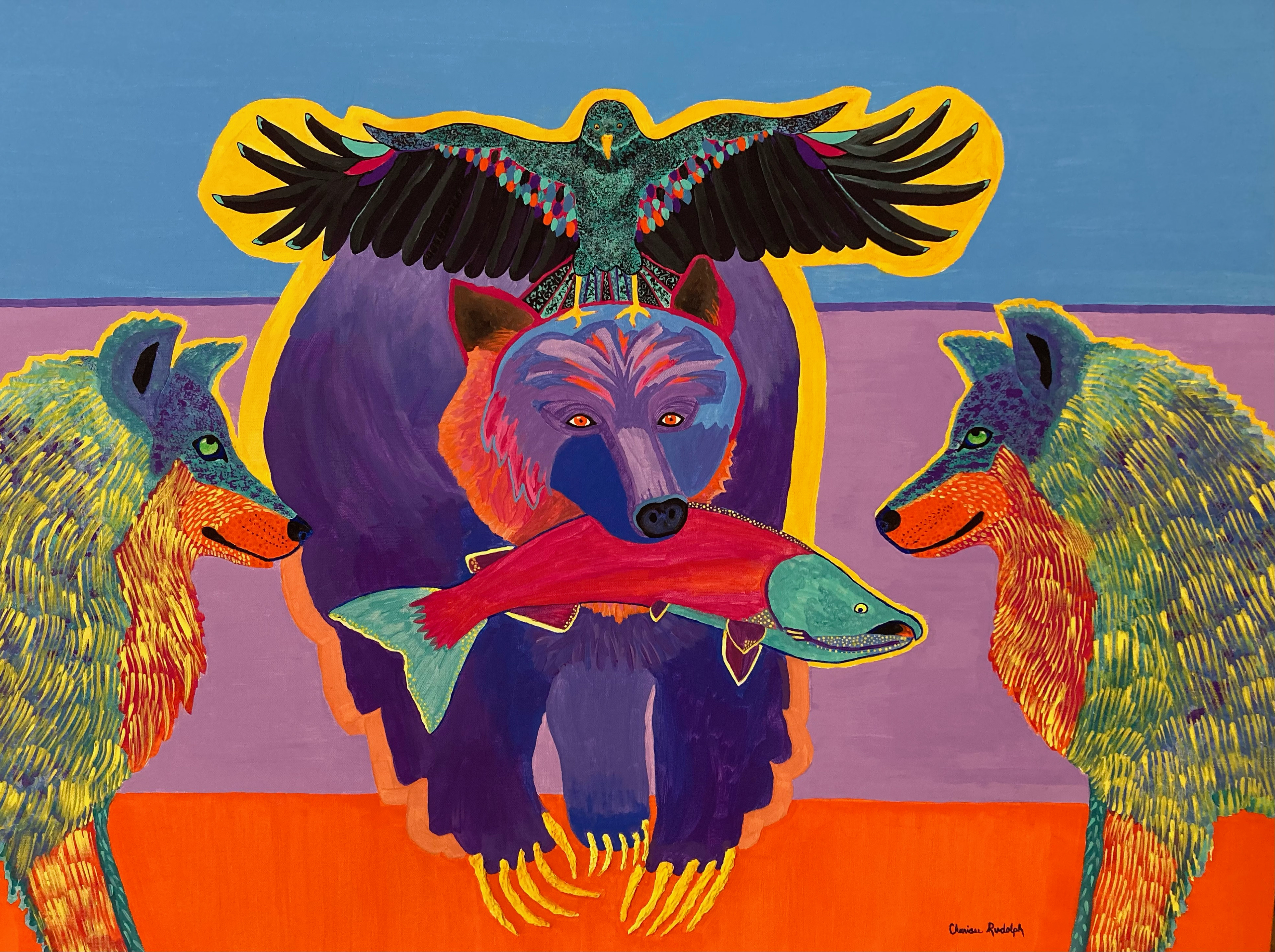 ACRYLIC - 30 X 40 - $7,200.00 IN DIFFERENT CULTURES THERE ARE DIFFERENT SYMBOLS THAT REPRESENTS THE TIME OF A PERSON'S BIRTH. IN THE NATIVE AMERICAN CULTURE THERE ARE TWELVE ANIMAL BIRTH SIGNS. THIS PAINTING WAS CREATED FOR A FAMILY OF FIVE.